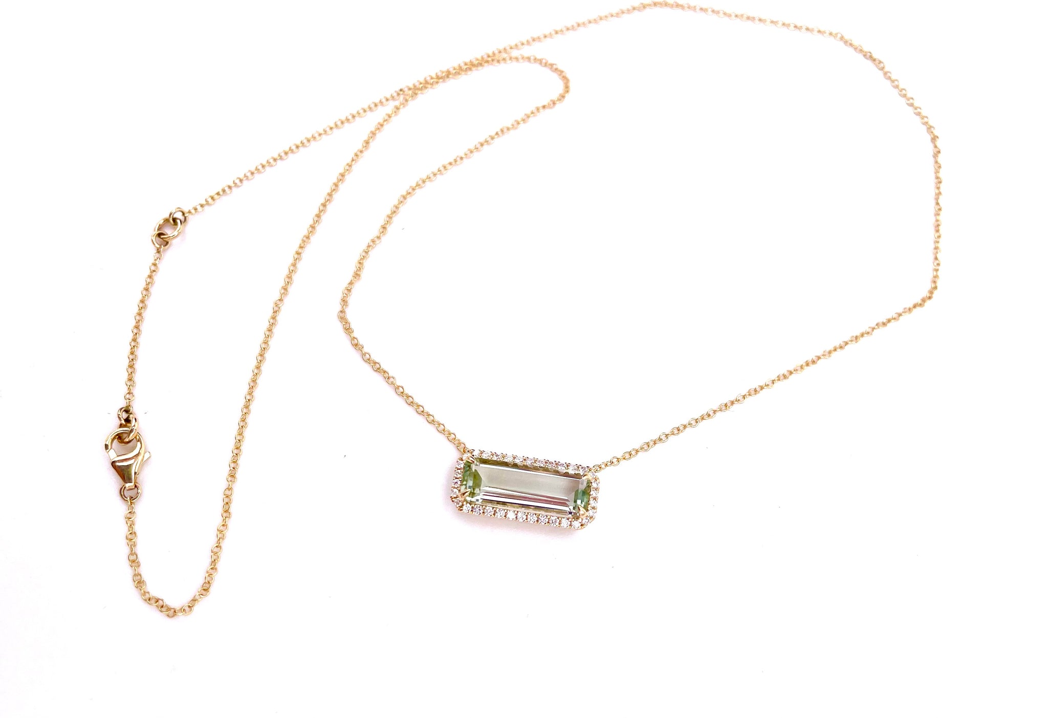 This pretty east west necklace features a 2.30 carat green amethyst that is accented by .17 carats of diamonds.  It is all set in 14K yellow gold, retail price $2850.00