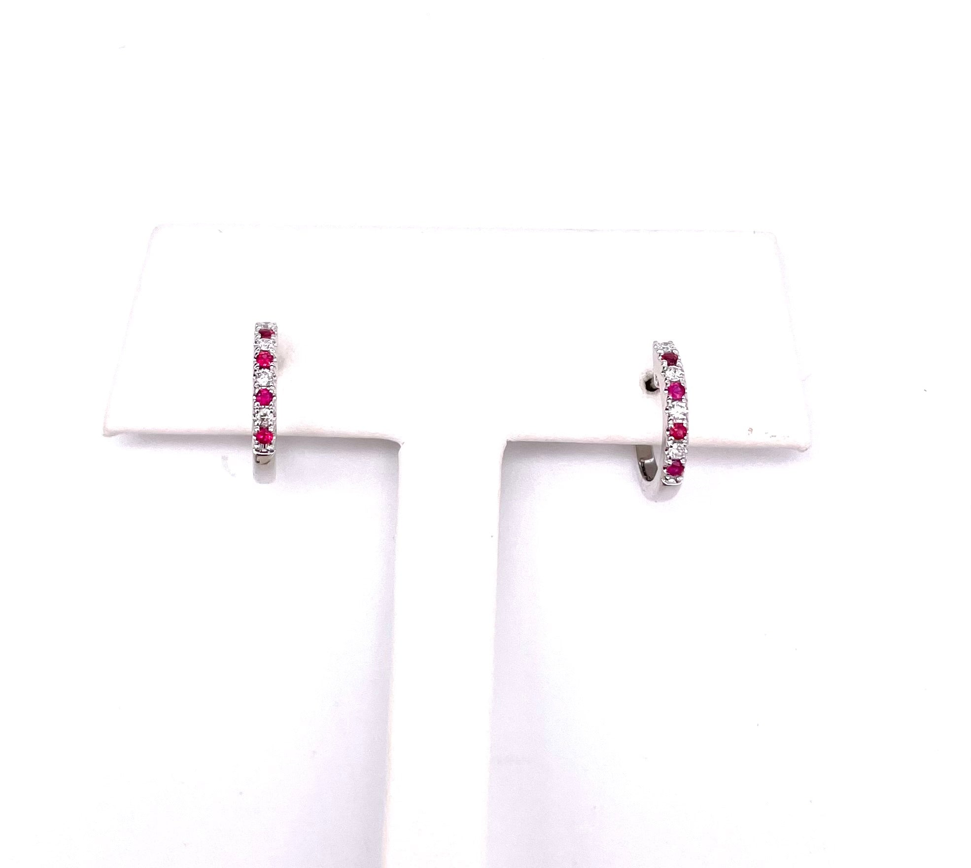 These small hoop earrings in 14K white gold feature.09 carats of diamonds and .12 carats of rubies. Retail price is $1425.00