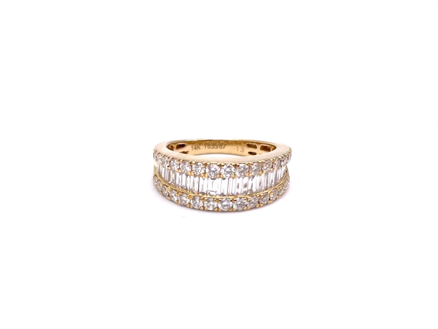 This diamond ring features a total of 1.49 carats of diamonds, all set in 14k yellow gold. Ring is currently a size 6.5, please inquire for further sizing. Retail price $4790.00