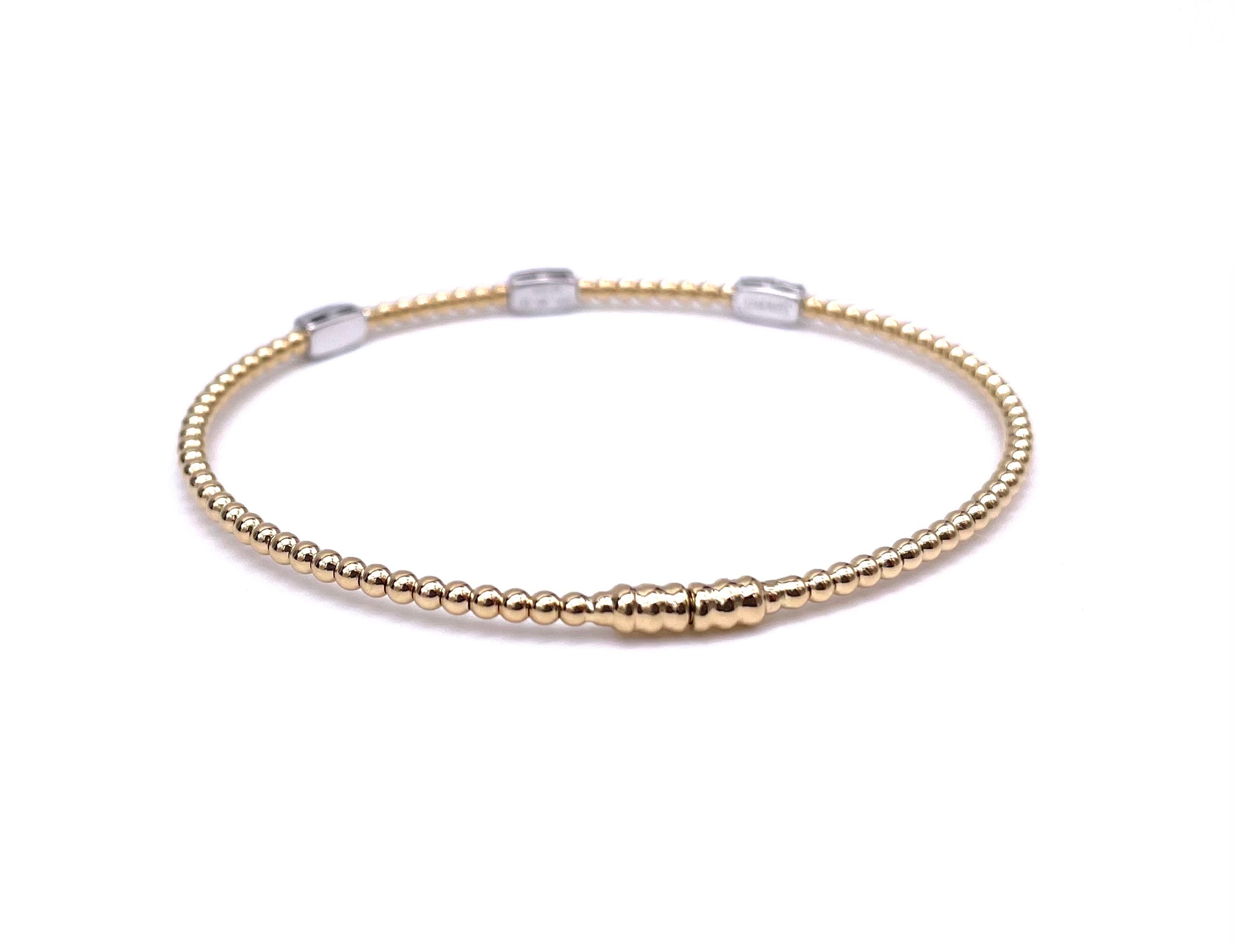 This bangle bracelet in 18K yellow gold features white gold stations with a total of .16 carats of diamonds. It has a magnetic closure for ease of wear. Retail price $2820.00