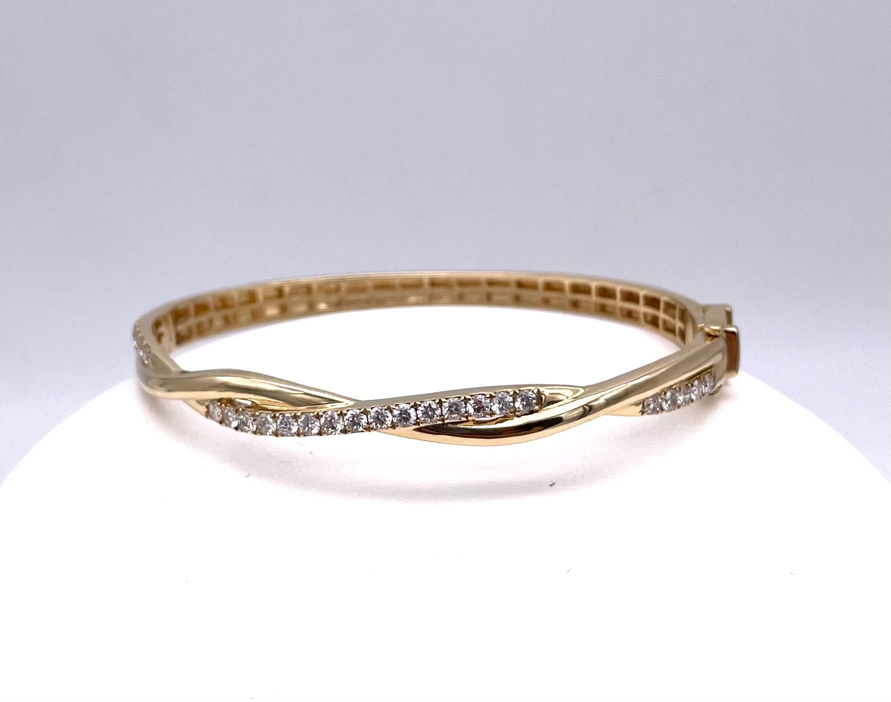 This beautiful 14K yellow gold hinged bangle has 1.00 carats of diamonds forming a subtle twist design. Retail price $5925.00