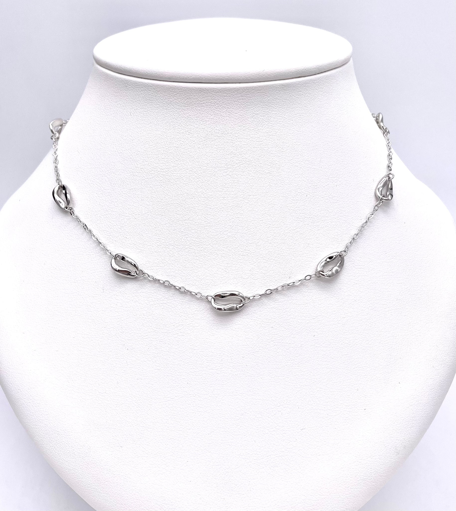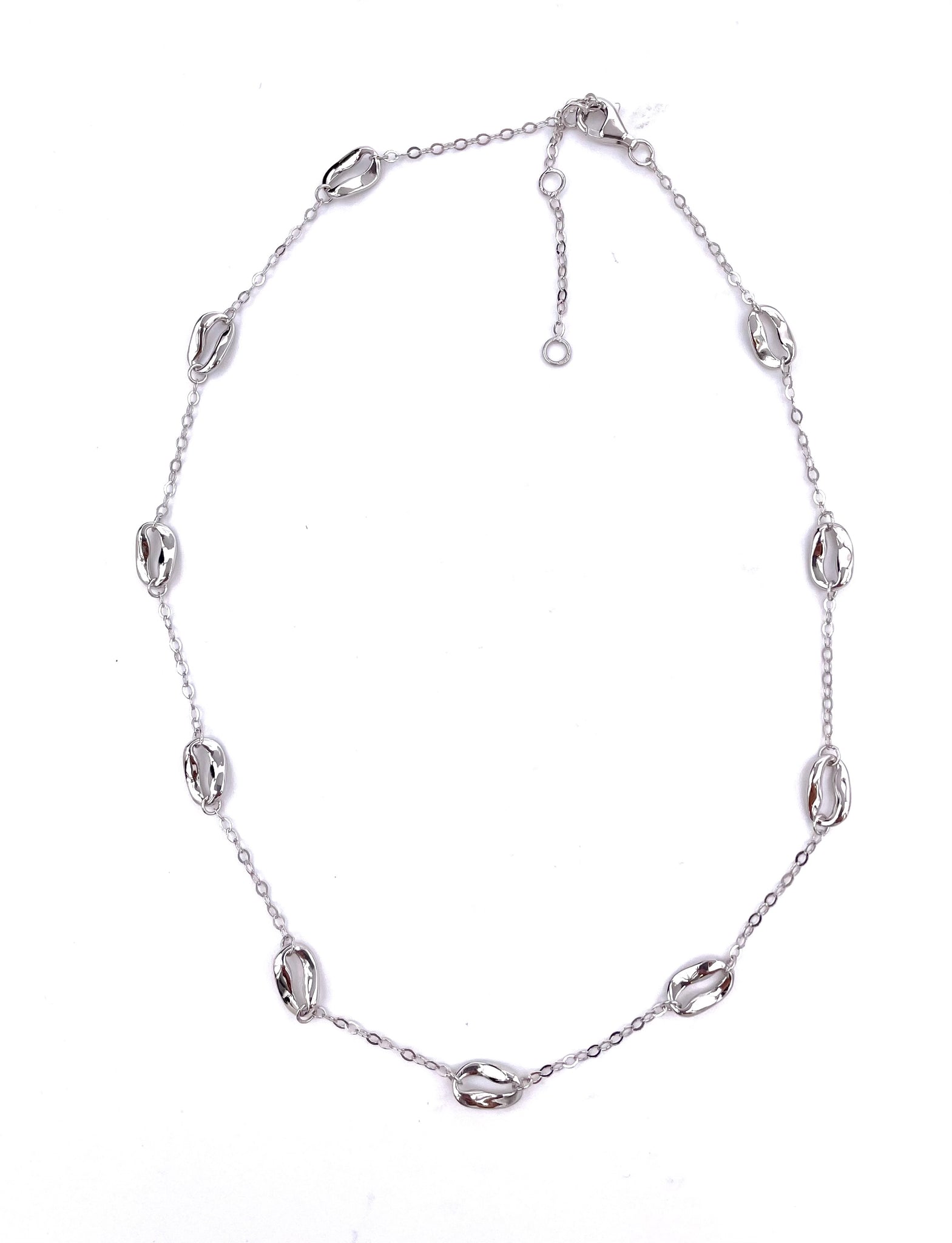 This pretty sterling silver necklace features high polished oval shaped stations on an adjustable length chain.  This comes from the Bean Collection by Jorge Revilla Spain.  Retail price $340.00