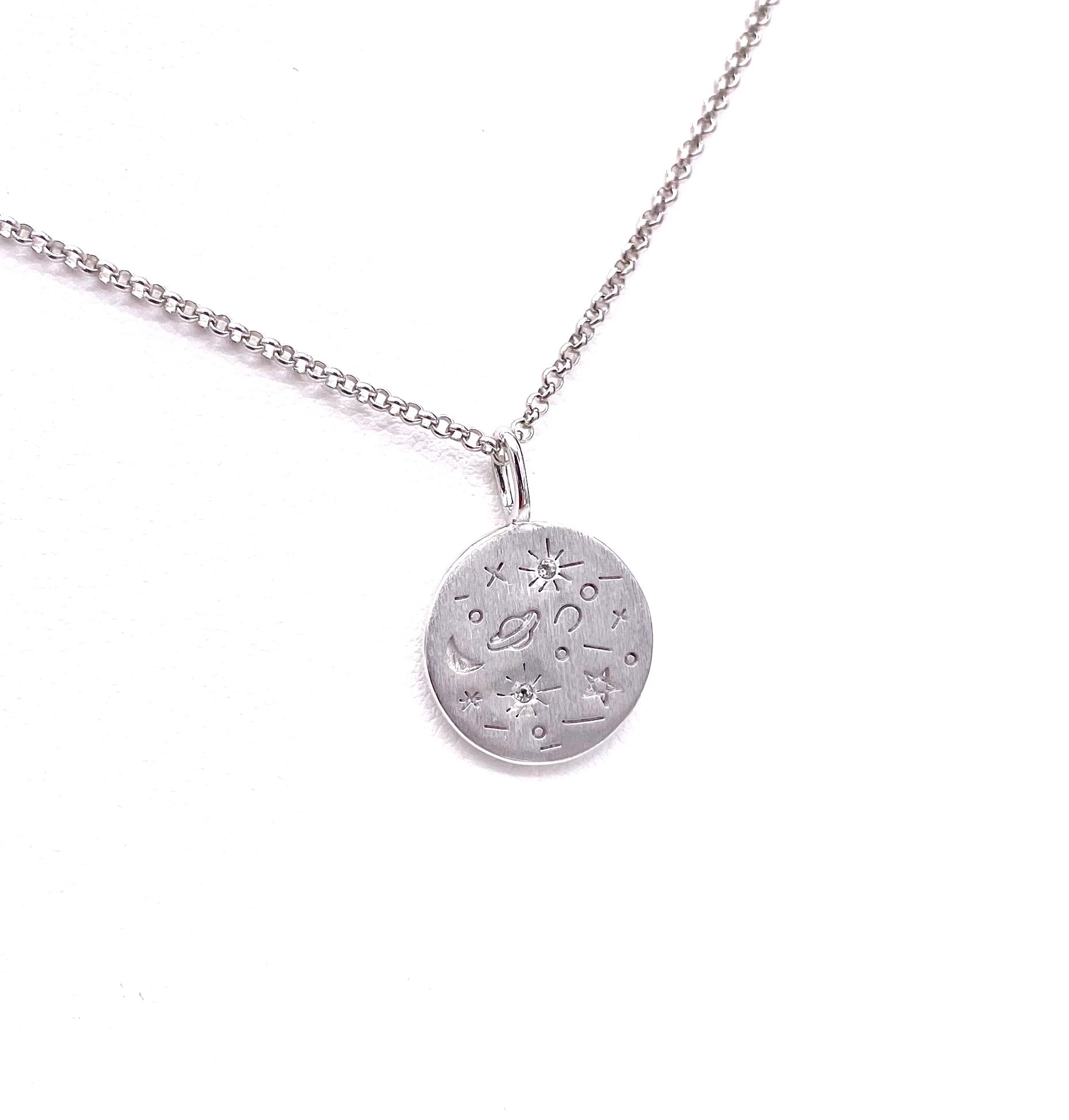This celestial necklace in sterling silver comes from the Planetarium Collection by Jorge Revilla Spain. It has a retail price of $155.00