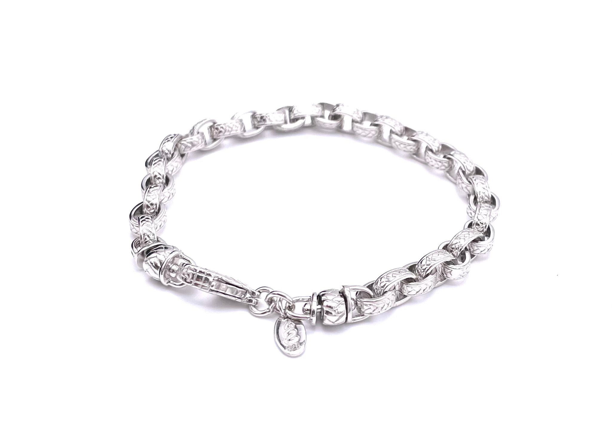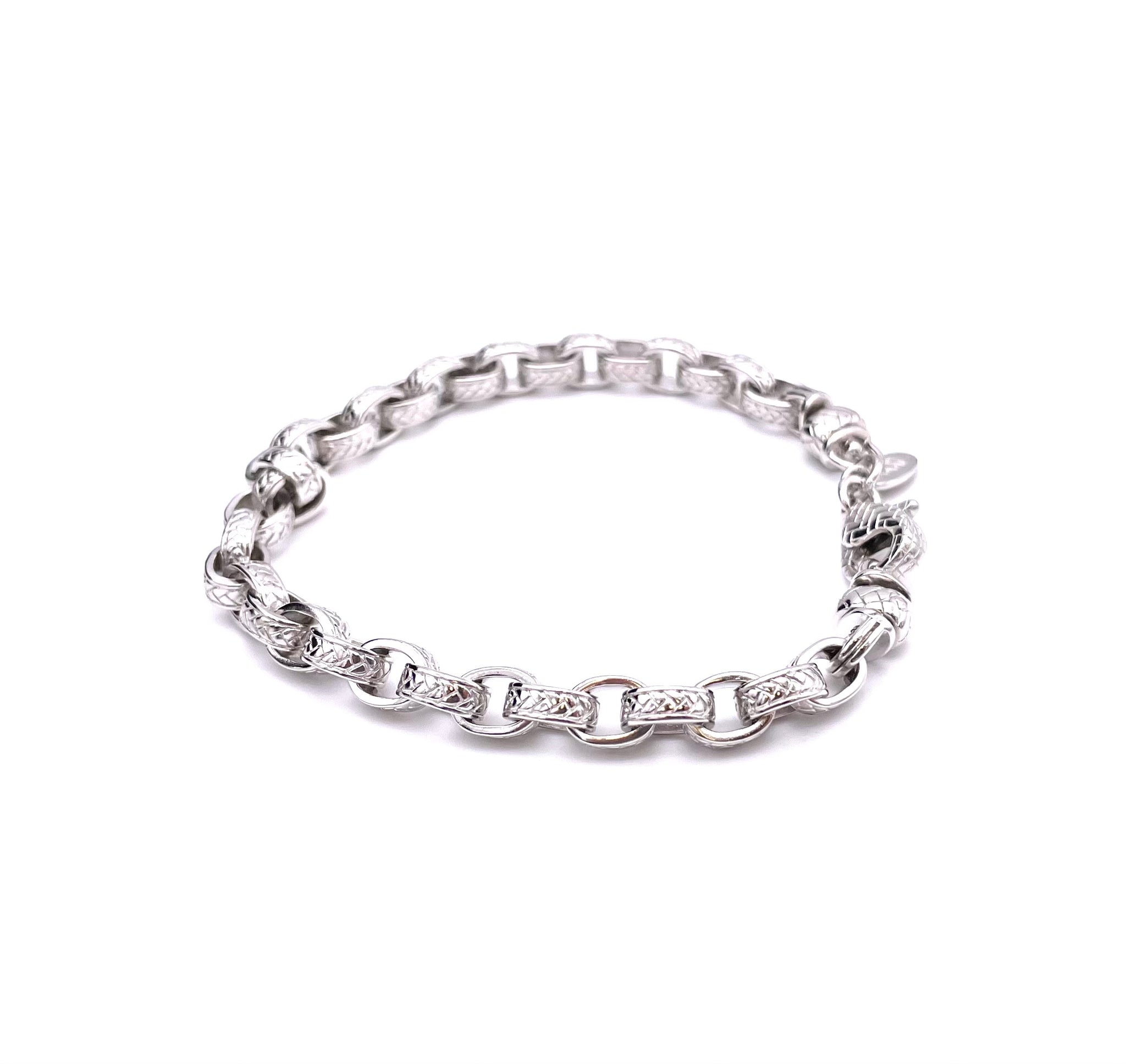 This heavy sterling silver decorative link bracelet measures 9" long.  It comes from the Rome Collection by Jorge Revilla Spain and is the perfect mens statement bracelet.  Retail price $630.00
