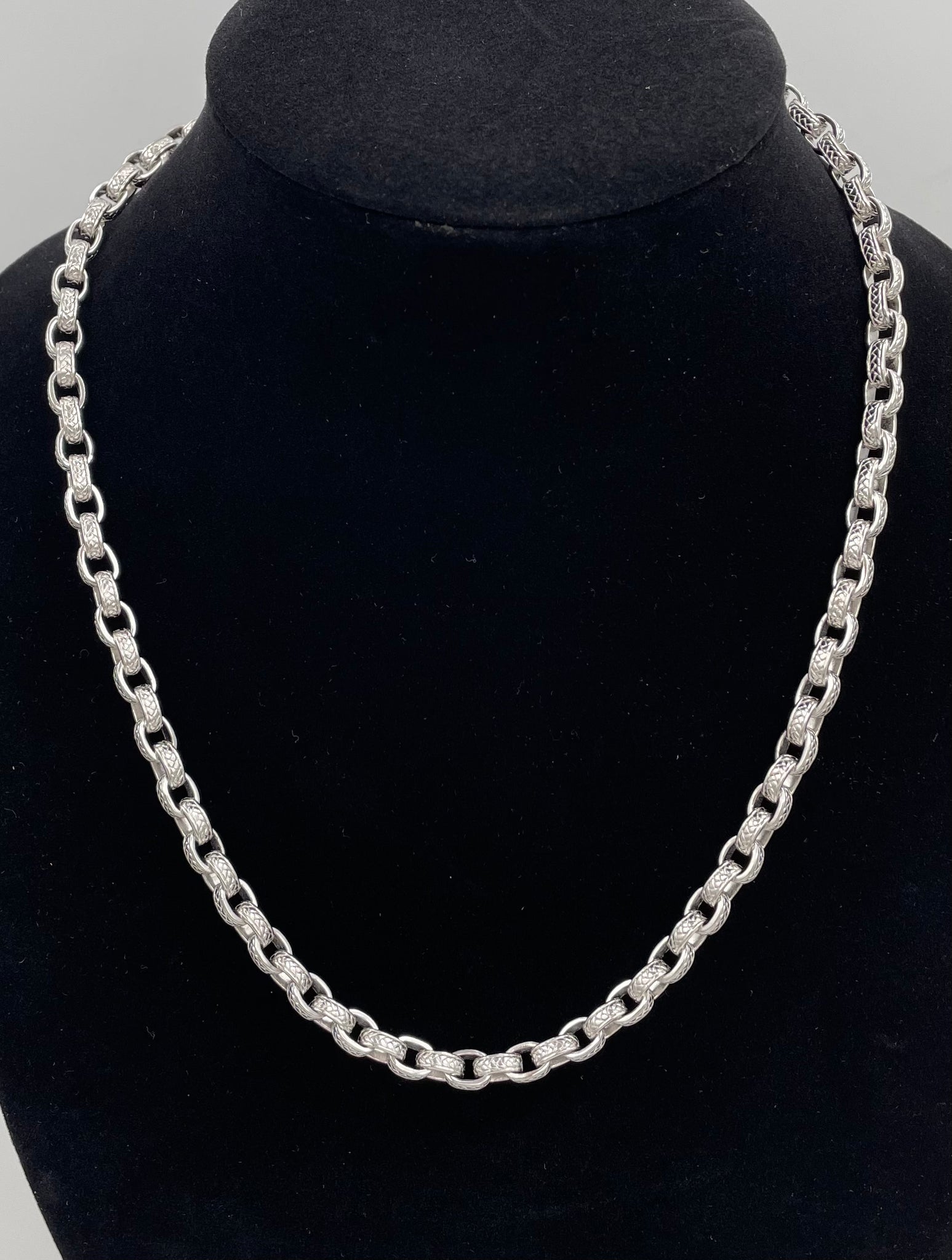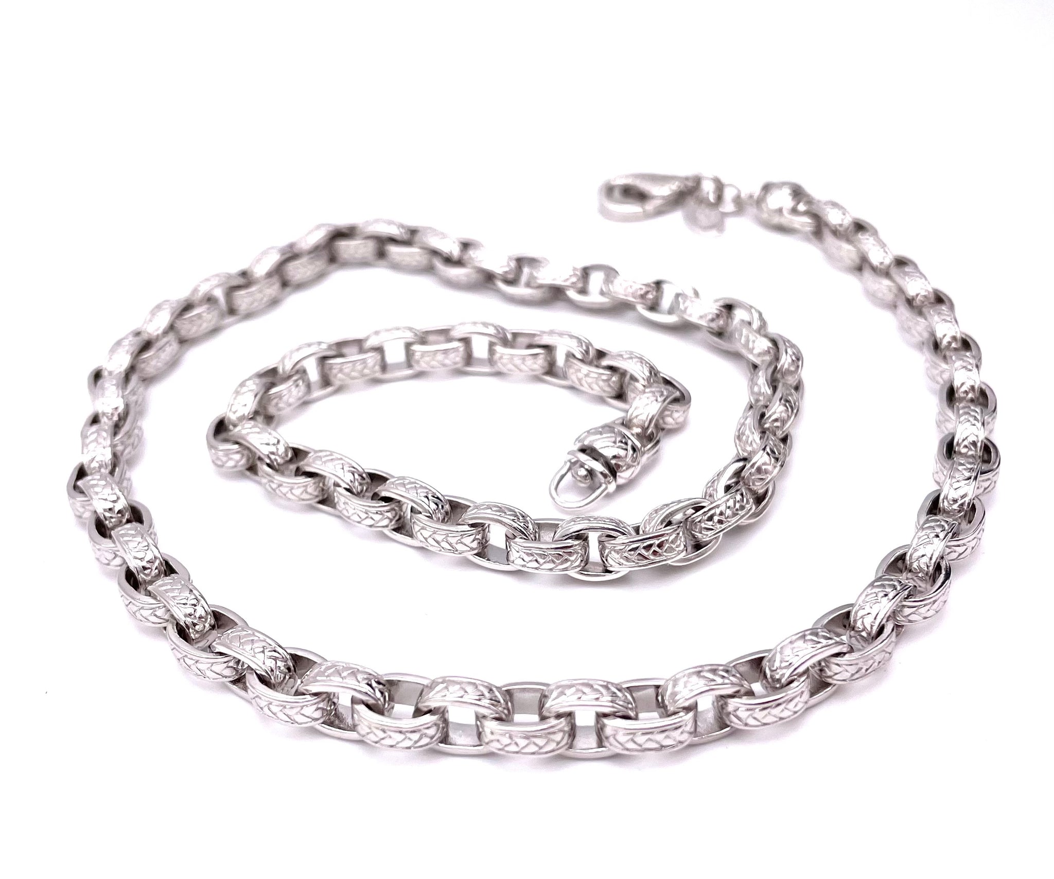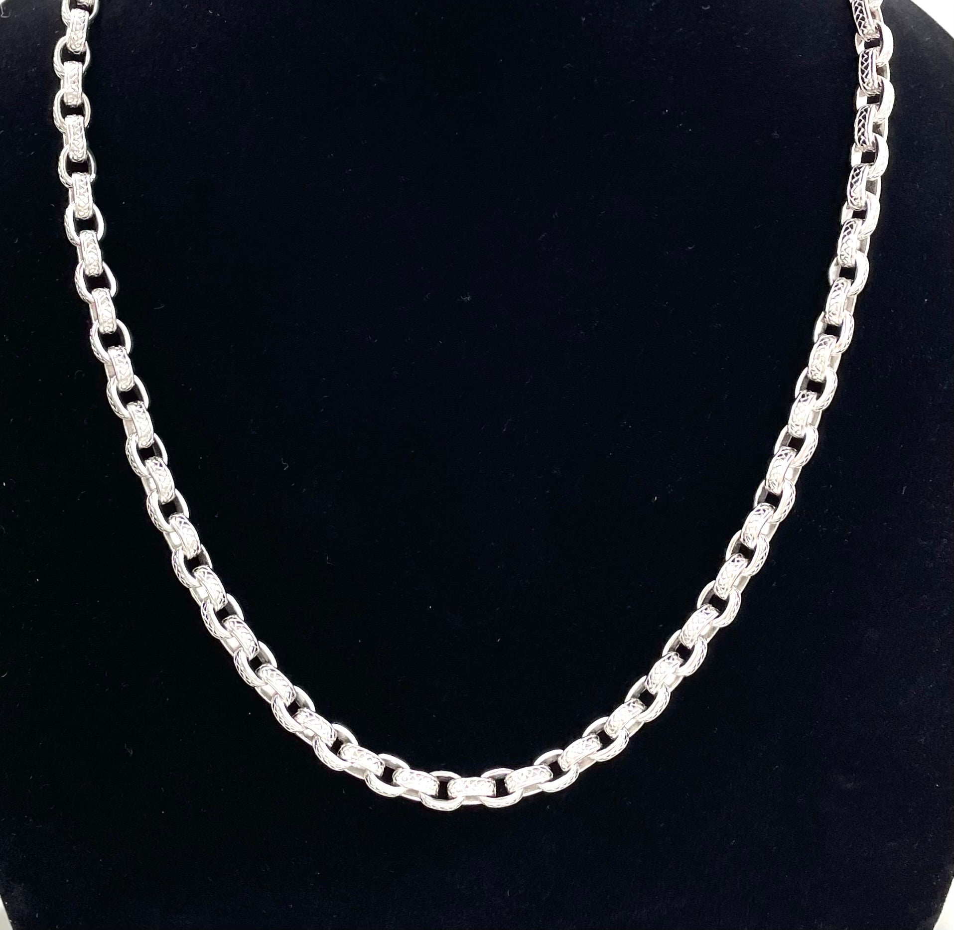 This heavy link chain measures just under 22" making it perfect for men or women. It comes from the Rome Collection by Jorge Revilla Spain. Retail price $1480.00