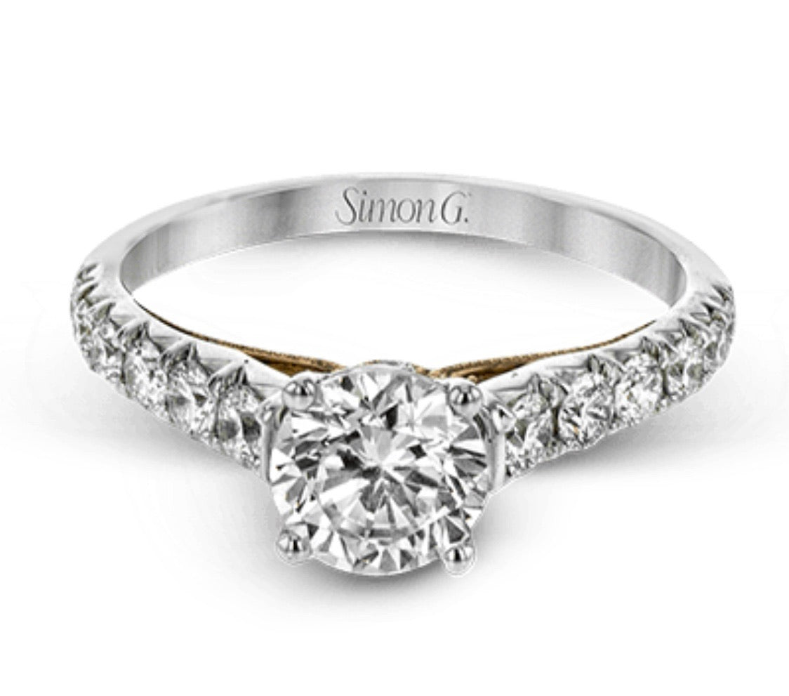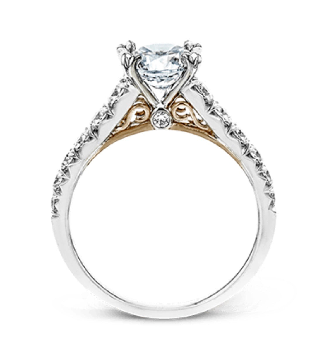 This sweet engagement ring features .55 carats of diamonds and a rose gold accent within the 18K white gold. Center stone not included, but we will be happy to help you select the perfect diamond for her.
