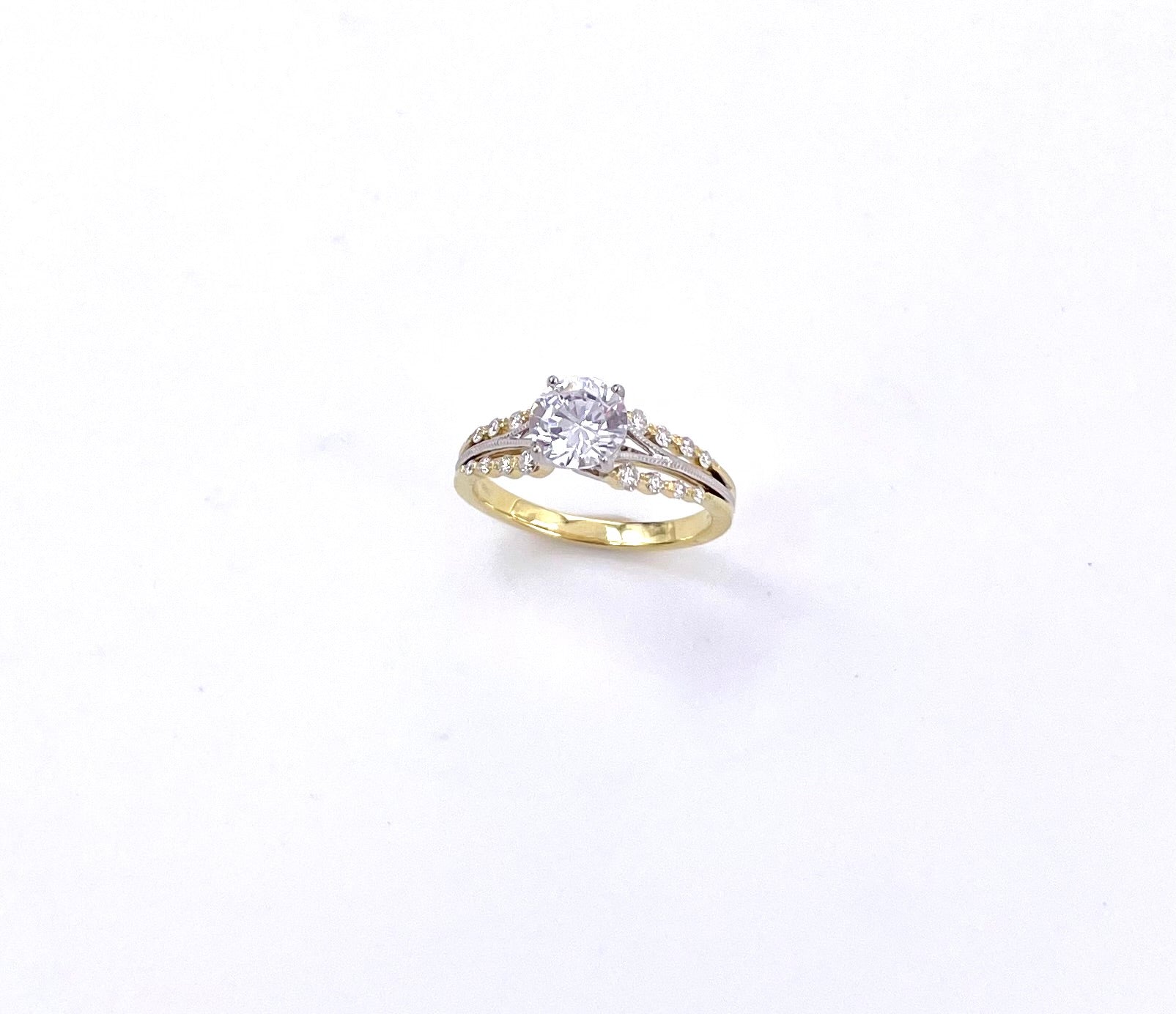 This beautiful engagement ring in 18K gold features .23 carats of accent diamonds. The center is currently a CZ. We look forward to helping you find the perfect diamond, either lab or natural, whichever you prefer! Ring is currently a size 6.5, please inquire for further sizing. Retail price $2850.00