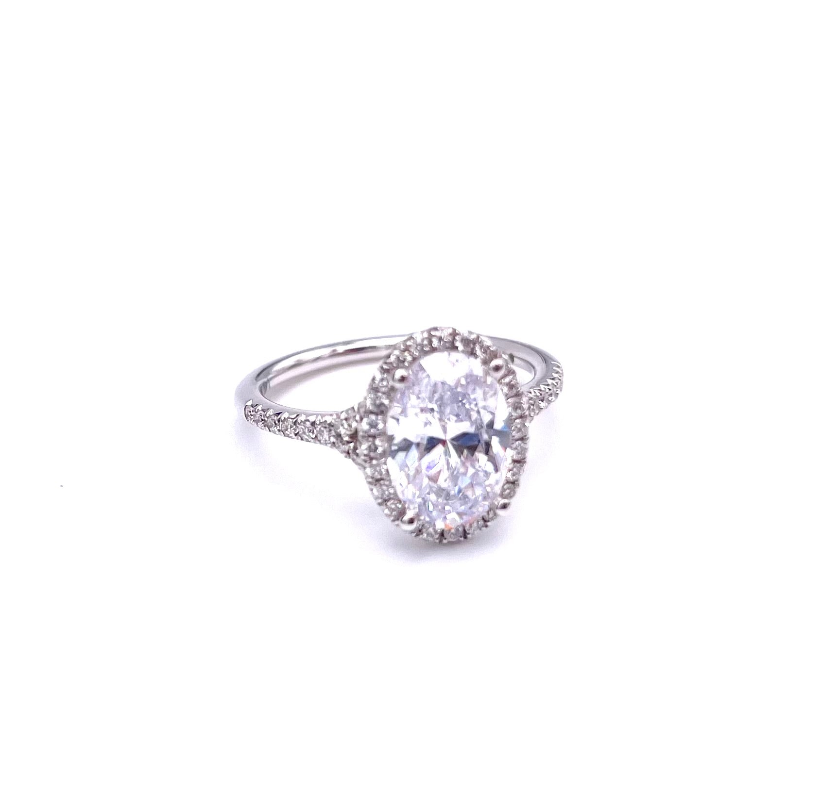 This beautiful ring in 14K white gold features .28 carats of natural side diamonds. The center is currently a CZ, so we look forward to helping you find the perfect natural or lab created diamond to give her! Retail price for semi mount $2595.00