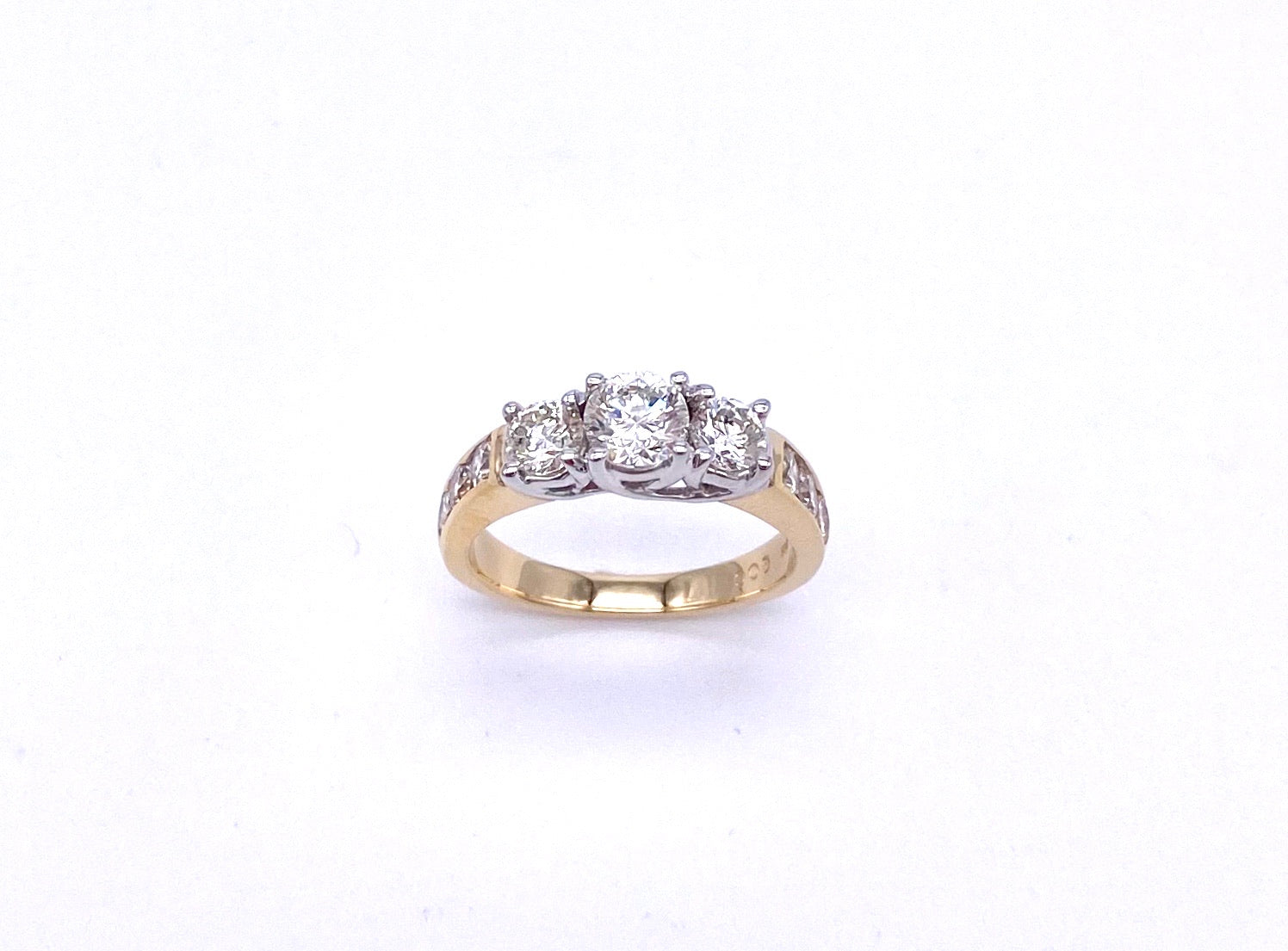 This gorgeous ring features a total of 1.50 carats of diamonds, including channel set side diamonds, all set in 14K yellow gold. Ring can be sized to accommodate finger size 6-8, our in house jewelers will take care of that for you! Retail price $4995.00